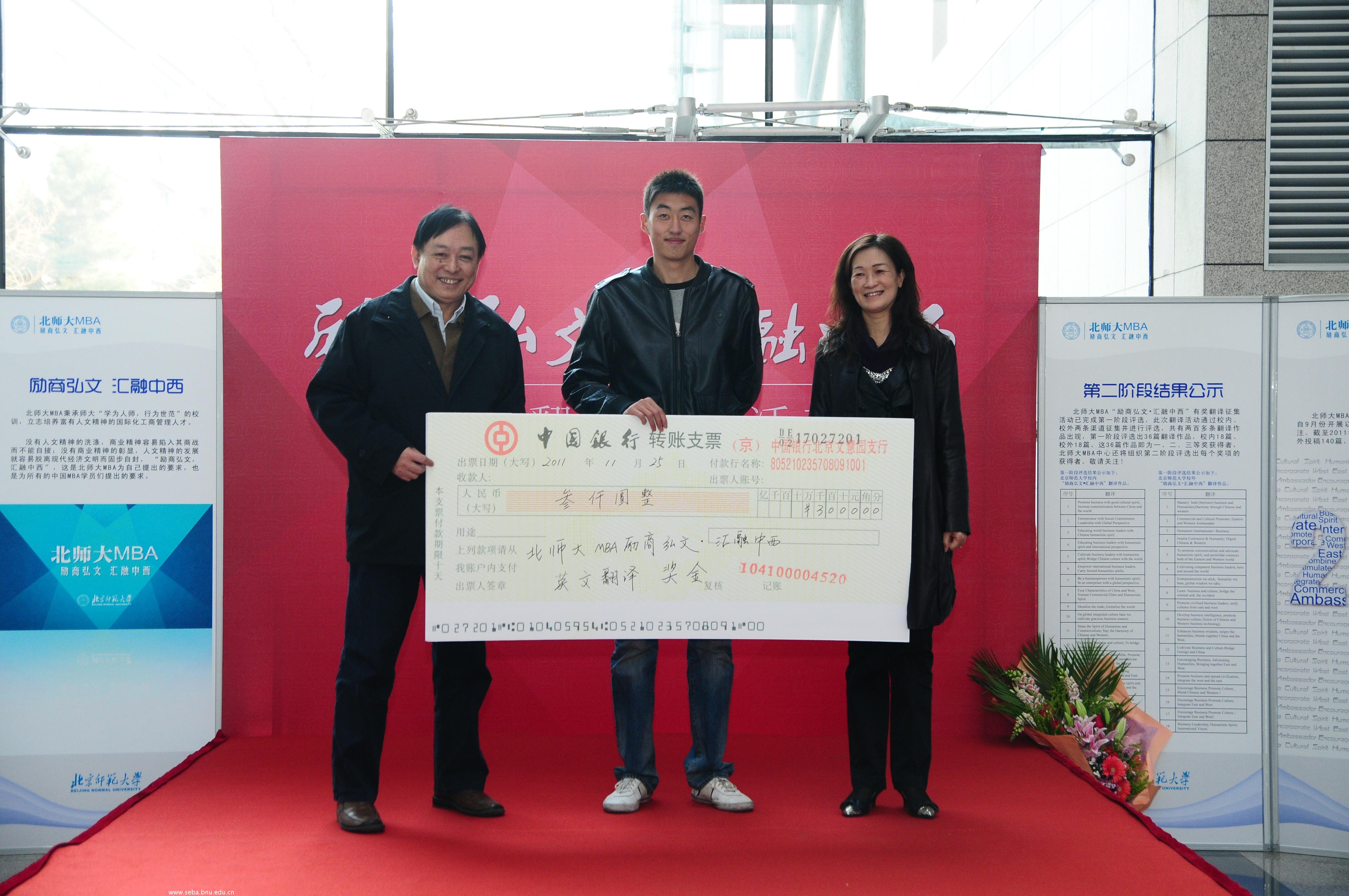 2011年11月25日,全国MBA教育指导委员会专家委员陈晓红教授、李新春教授、徐康宁教授莅临我校,对工商管理硕士(MBA)专业学位教学合格情况进行评估。以此为契机,北师大MBA中心举行了颁奖仪式,为“北师大MBA‘励商弘文•汇融中西’英文翻译征集活动”的校内部分第一名颁奖,来自体育学院的侯金鹏。经管学院副院长杨澄宇教授主持了此次颁奖仪式,并在现场通过国际长途连线了校外部分的第一名,来自普林斯顿大学的张哲赟,感谢对北师大MBA的支持及获奖的祝贺。
