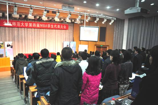 2011年12月20日晚七点,北京师范大学第四届MBA学生代表大会在敬文讲堂隆重举行。出席本届大会的有北师大经管学院高明华副院长、葛玉良副书记、MBA中心张平淡主任、院长助理、MBA中心副主任狄承锋老师以及各位经管学院老师、候选人和各班推举出的学生代表。另外,北师大研究生会干部也应邀出席了本次会议。大会在庄严的国歌声中拉开了帷幕。