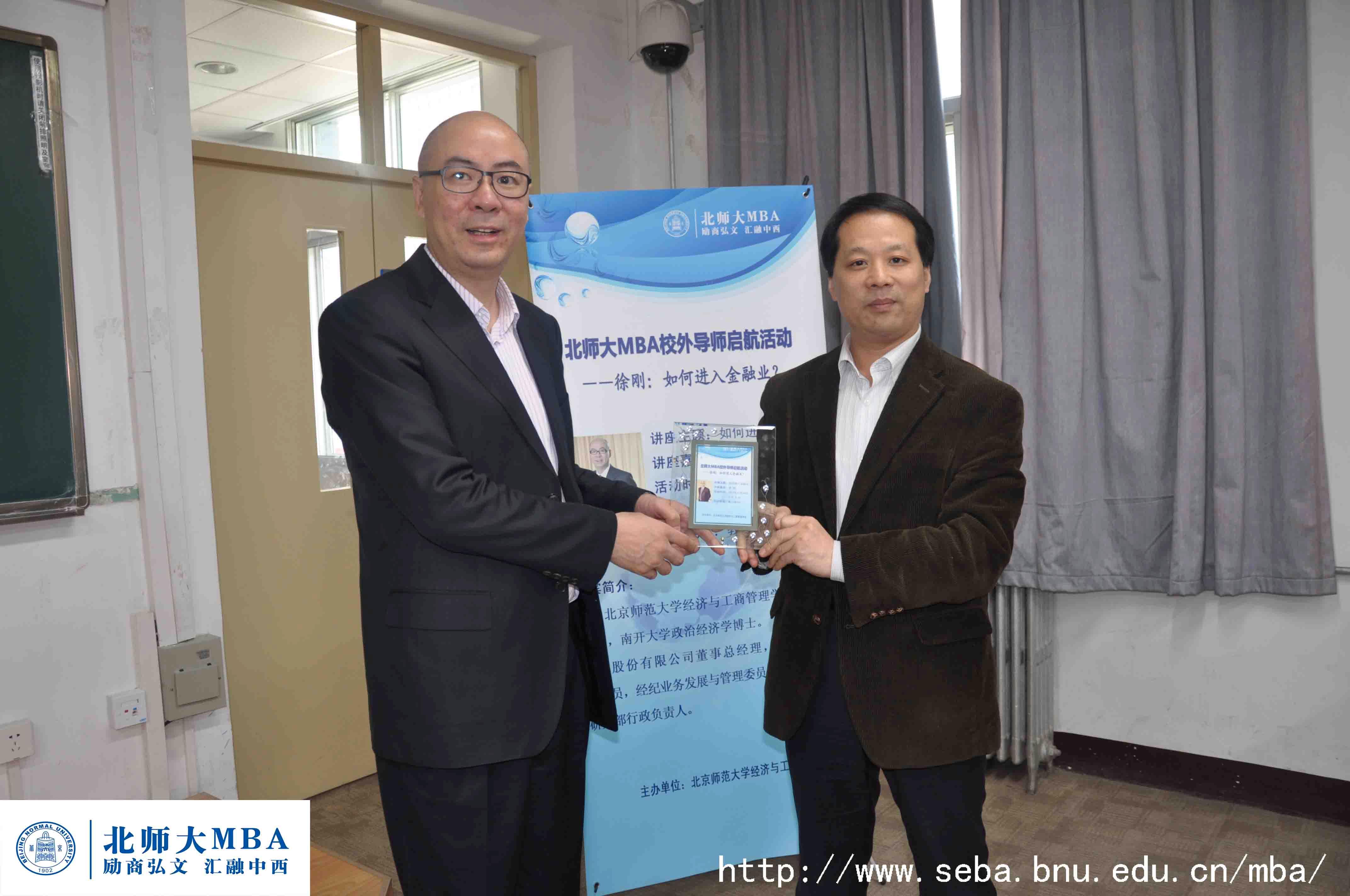 金融业在国民经济中处于牵一发而动全身的地位,是国民经济发展的晴雨表,关系到经济发展和社会稳定,为了让北师大MBA的同学们在金融从业之路中步伐迈得更加轻盈,在激烈的竞争中成功地脱颖而出,2011年12月24日9:30,北师大MBA校外导师起航系列活动在教二201成功举办。本次活动由经管学院副院长高明华老师主持,校外导师徐刚老师主讲。徐刚老师现任中信证券股份有限公司董事总经理,同时兼任执行委员会委员,经纪业务发展与管理委员会主任委员等职务。