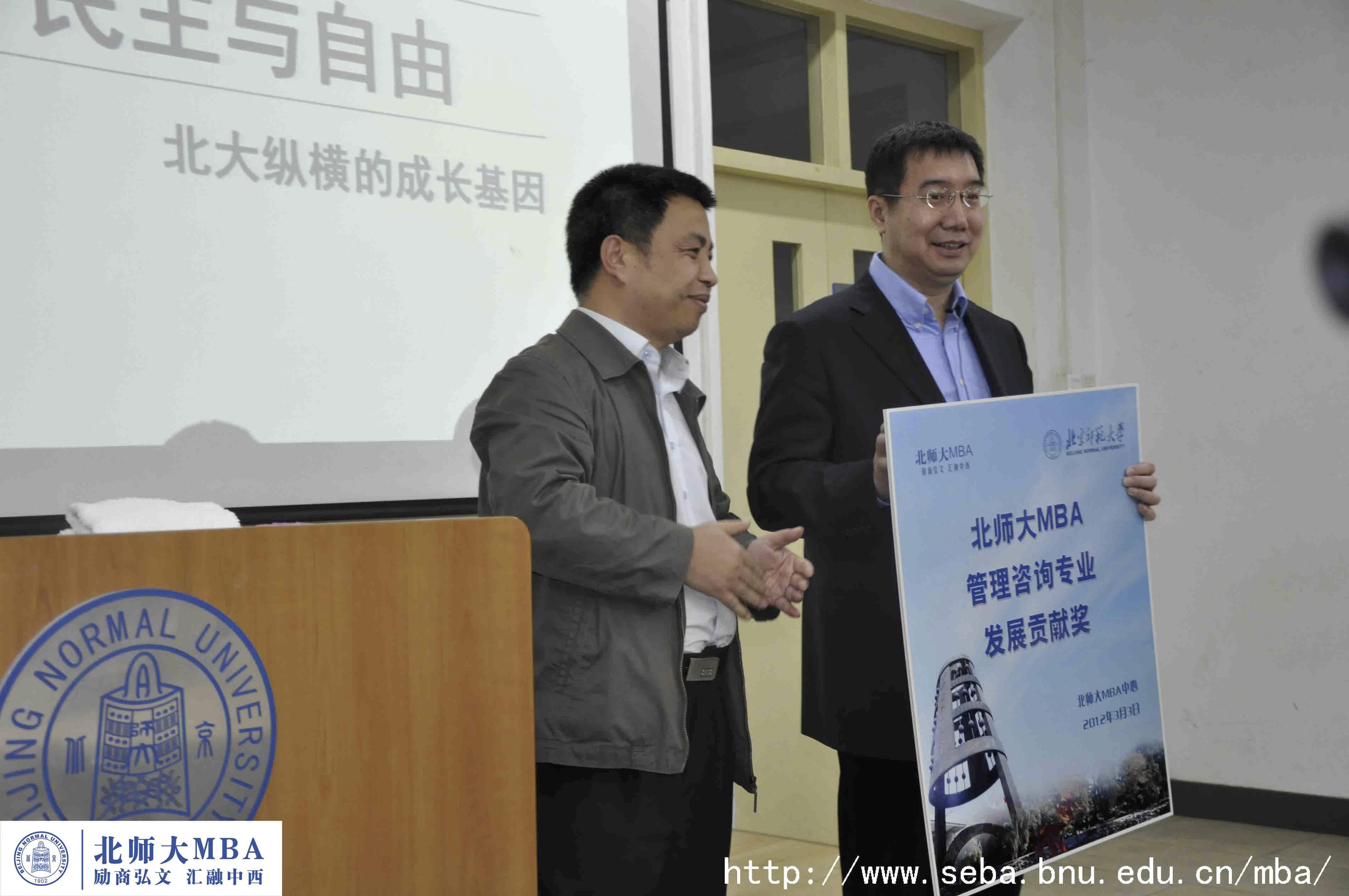 首先,赖德胜院长向嘉宾介绍了北师大MBA项目及励商弘文系列讲座,其中管理咨询专业是北师大MBA的特色之一,凝聚了社会上的许多资源,为学生提供了良好的实践、就业平台,北大纵横一直和北师大保持密切的联系,借此机会赖德胜院长代表北师大MBA中心为王璞先生颁发了“北师大管理咨询专业发展贡献奖”。