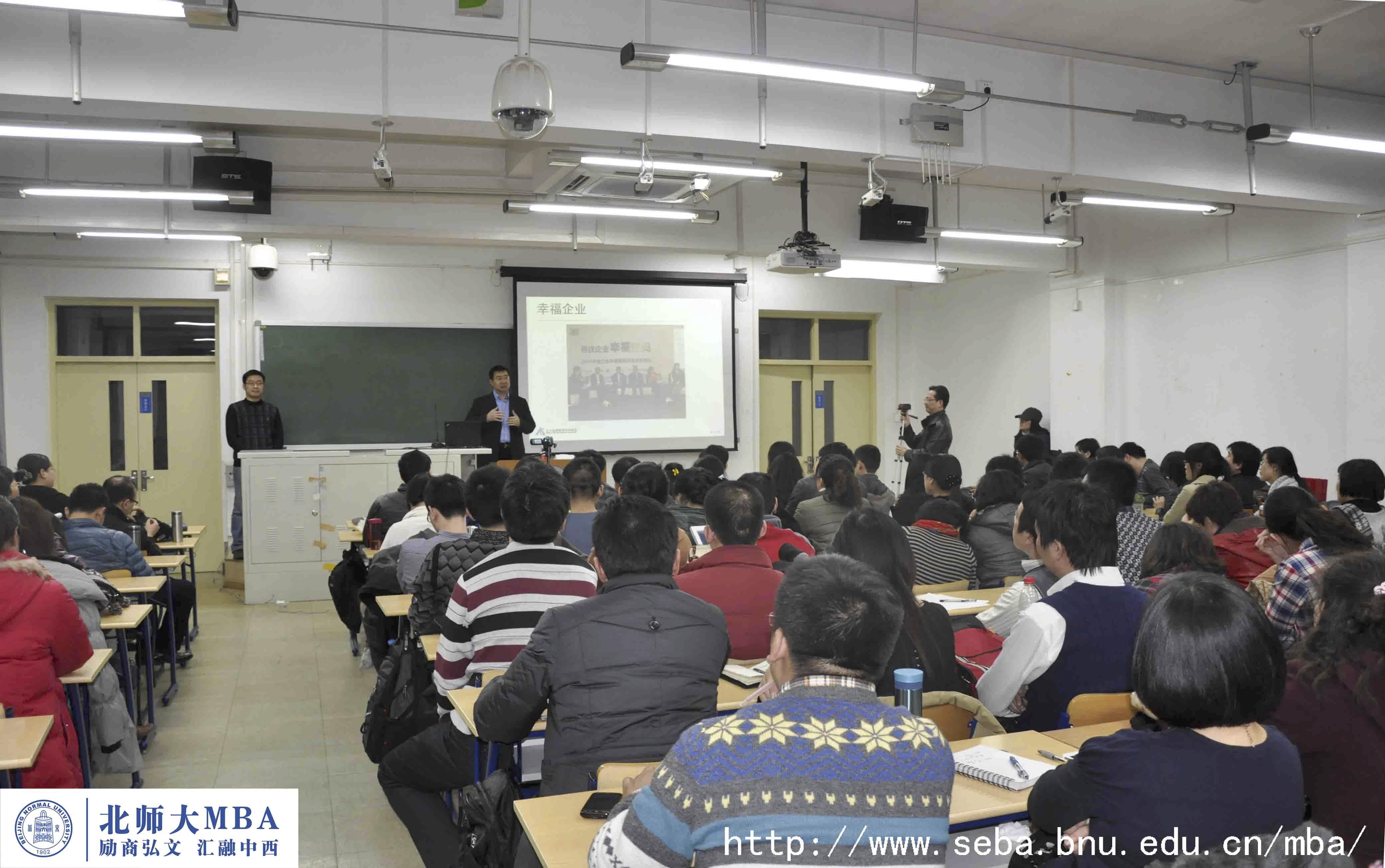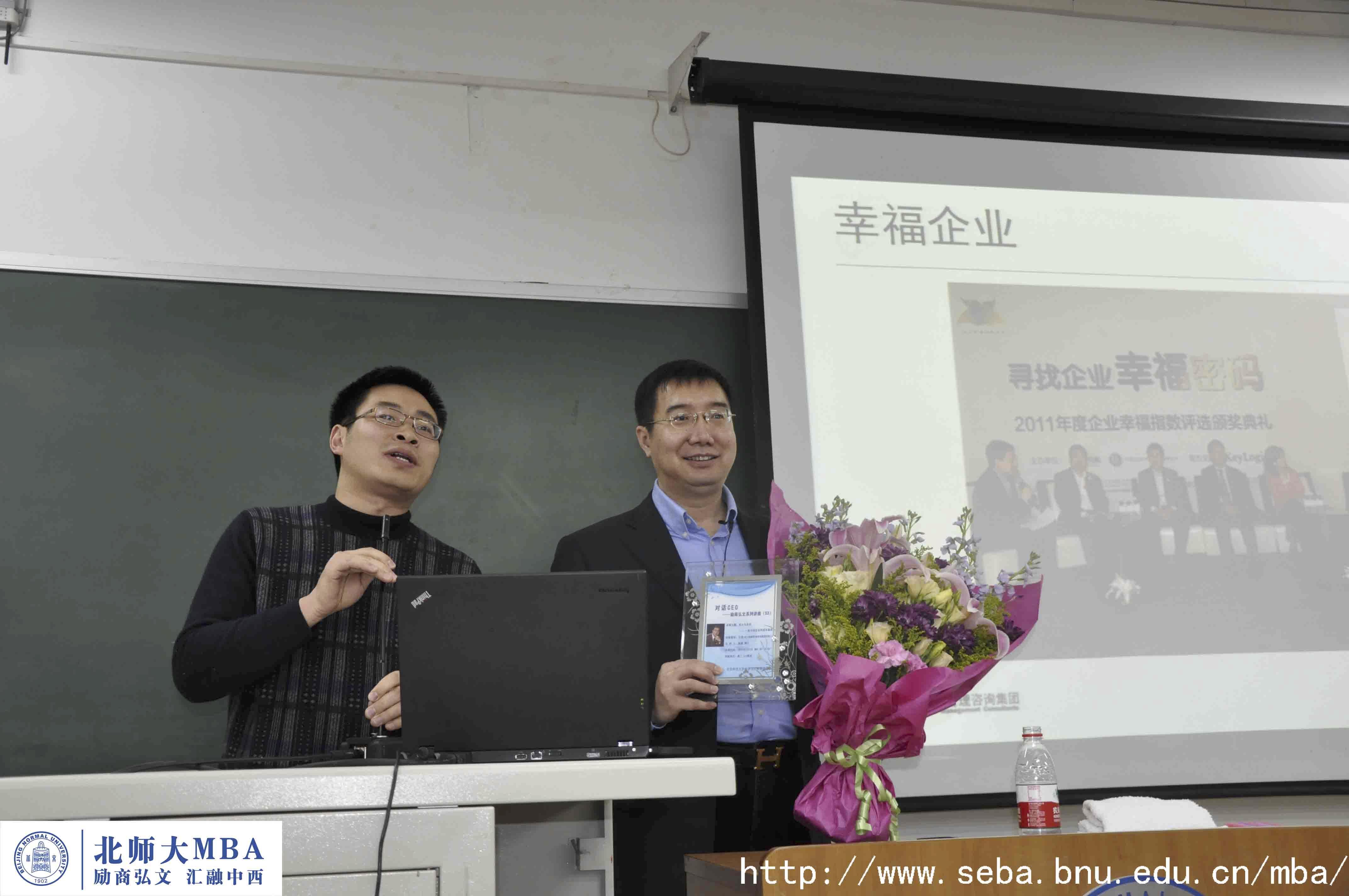 2012年3月3日晚6点半在教二312成功举办了北师大MBA励商弘文系列讲座第53期,也是2011-2012春季学期的第一讲。本次讲座很荣幸地请到了北大纵横管理咨询集团的创始人/CEO王璞先生,同时王璞先生刚刚参加了2月28日在京举行的2011年企业幸福指数颁奖典礼,北大纵横当选为2011年度最具幸福感咨询企业。北师大经管学院院长赖德胜教授、院长助理兼MBA中心副主任狄承锋副教授出席了本次讲座,讲座现场座无虚席。