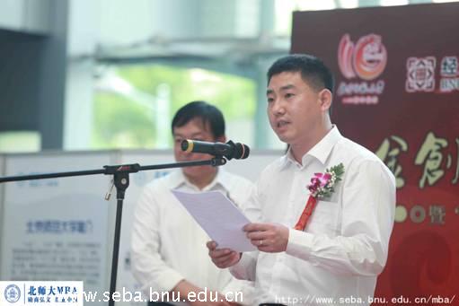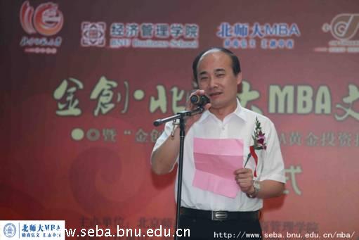 在开幕式上,北京师范大学校长助理曹卫东教授、经管学院院长赖德胜教授以及金创黄金(上海)有限公司总经理穆春江先生等嘉宾先后致辞。参加此次开幕式的嘉宾还有金创黄金(上海)有限公司浦东分部总经理顾雄新先生、首席培训师刘顺民先生、大学生杂志社总编辑陶世坦老师、光明日报社科技部主编胡其峰先生、北京师范大学教育基金会秘书长范立双老师、研工部部长应中正老师、团委书记柏贞尧老师、研究生院专业学位处副处长孙富强老师、中国MBA联盟成员以及北京各院校MBA联合会、北师大研究生会、学生会代表。