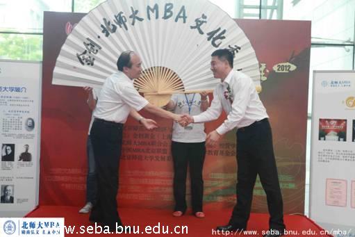 接下来,曹卫东教授以及穆春江先生为金创•北师大MBA文化季(2012)揭幕,一同展开由经管学院前总支书记王同勋教授亲手所写活动主题扇面。
