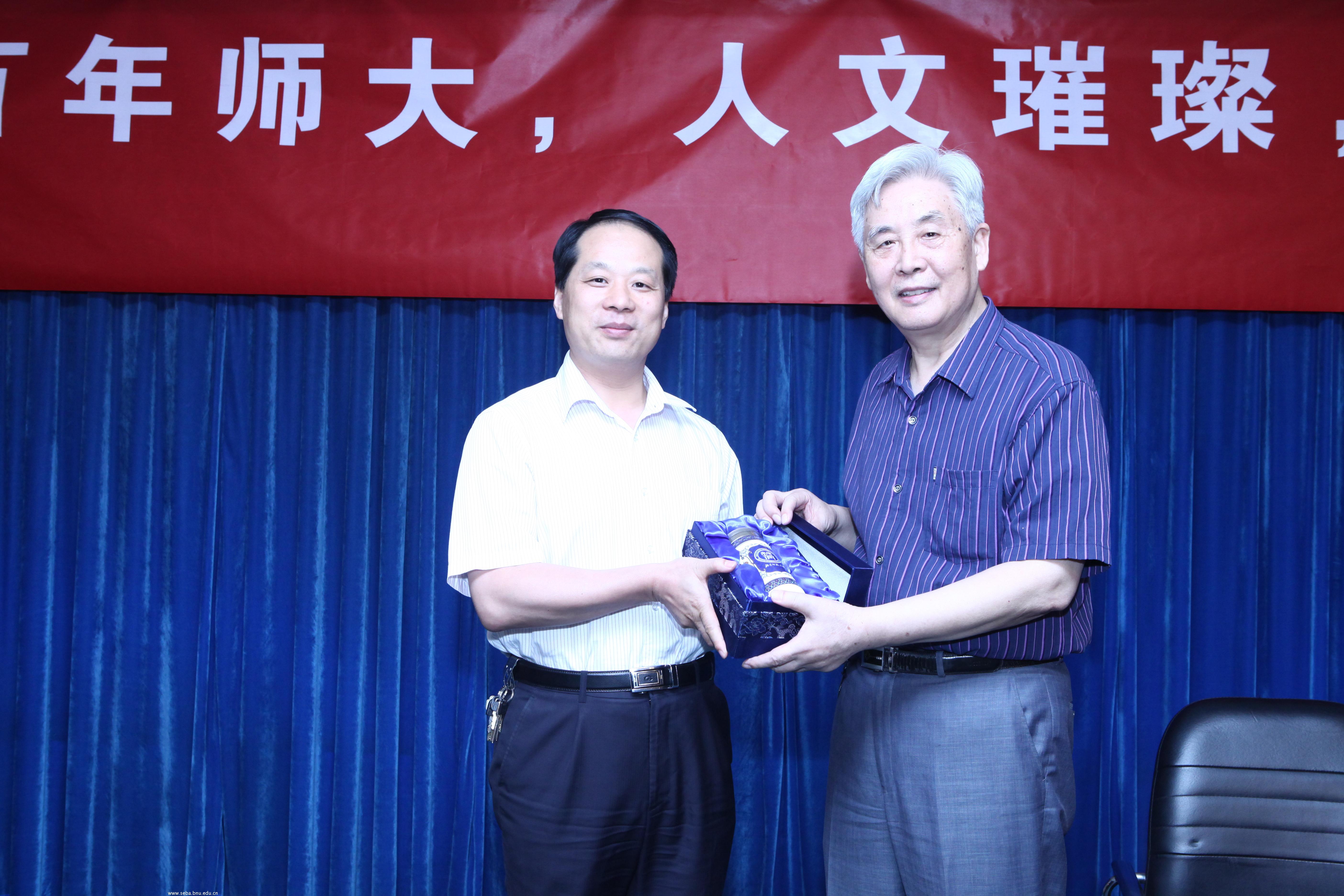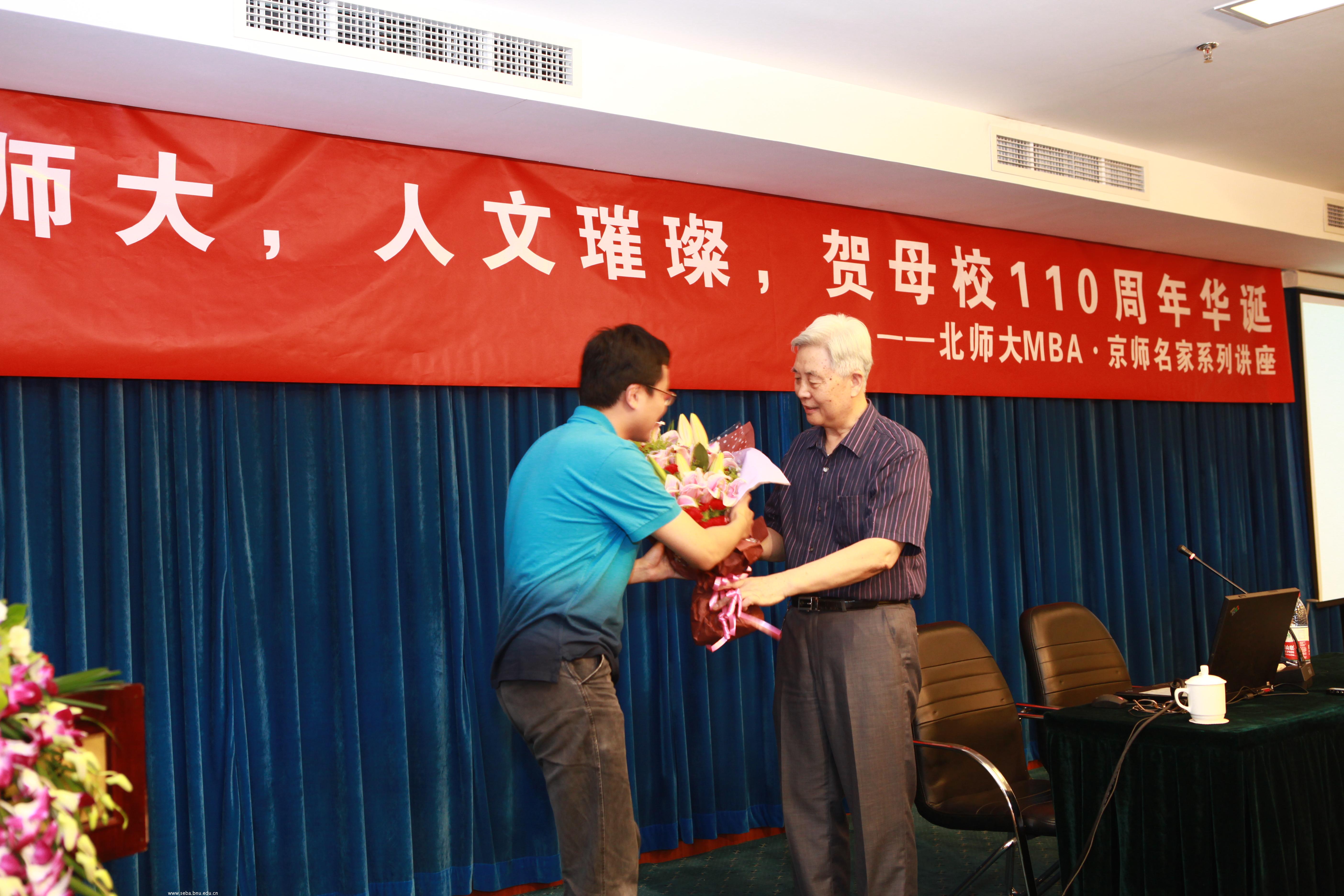 图4: 北师大经管学院副院长高明华教授向赵仁珪教授赠送北师大MBA纪念品