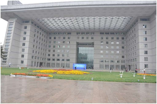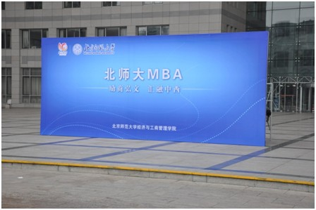 北师大经管学院制作了背景板,以起到宣传的作用。背景板设立在主楼前广场,北师大MBA的品牌slogan“励商弘文·汇融中西”赫然醒目,矗立在广场中央,与周围的环境互相衬托。