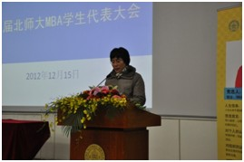 2012年12月15日18:30,北京师范大学第五届MBA学生代表大会在敬文讲堂隆重举行。出席本届大会的有北京师范大学经济管理学院葛玉良副书记、高明华副院长、MBA中心张平淡主任、院长助理、MBA中心副主任狄承锋老师、院团委书记张璇老师以及MBA中心老师、候选人和各班推举出的学生代表。另外,经管学院研究生会主席郝壮、学生会主席耿园也应邀出席了本次会议。