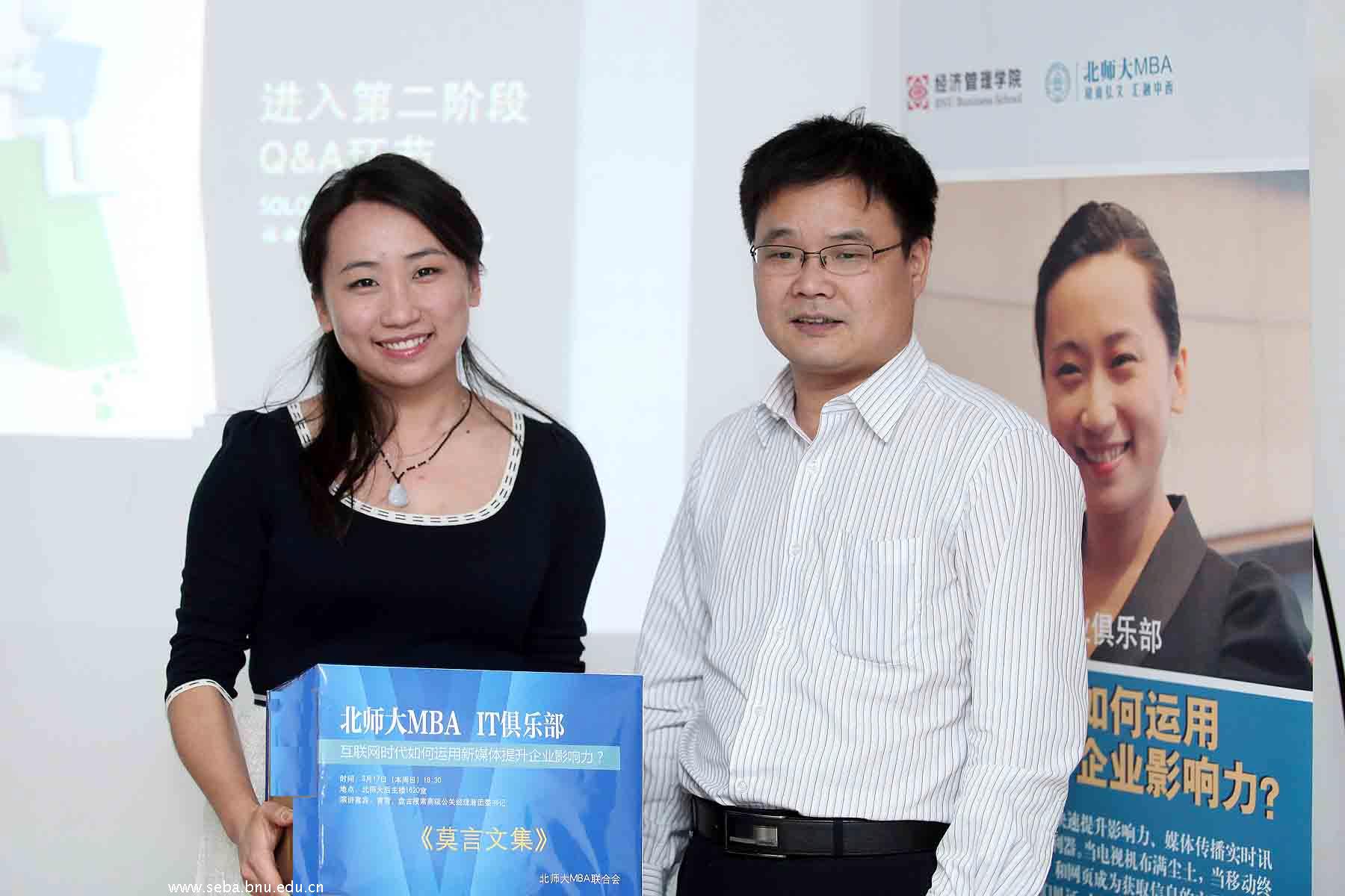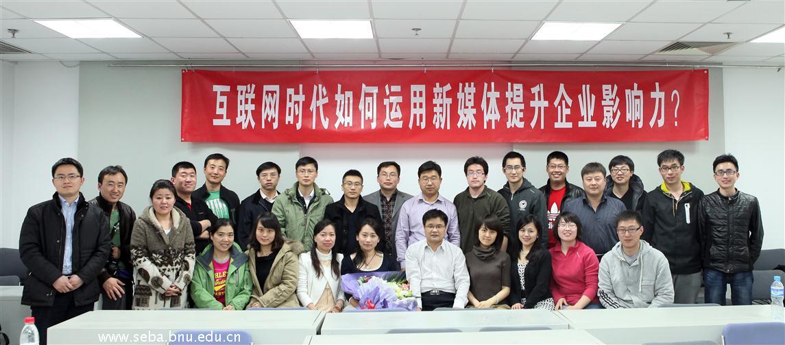 2013年3月17日,由北师大MBA联合会主办的走进北师MBA讲座在后主楼1620室举行。盘古搜索高级公关经理曹雪女士为大家带来了题为“互联网时代如何运用新媒体提升企业影响力?”的精彩演讲。北师大经管学院党委副书记葛玉良老师应邀出席,讲座由MBA联合会外联部部长焦杨主持。