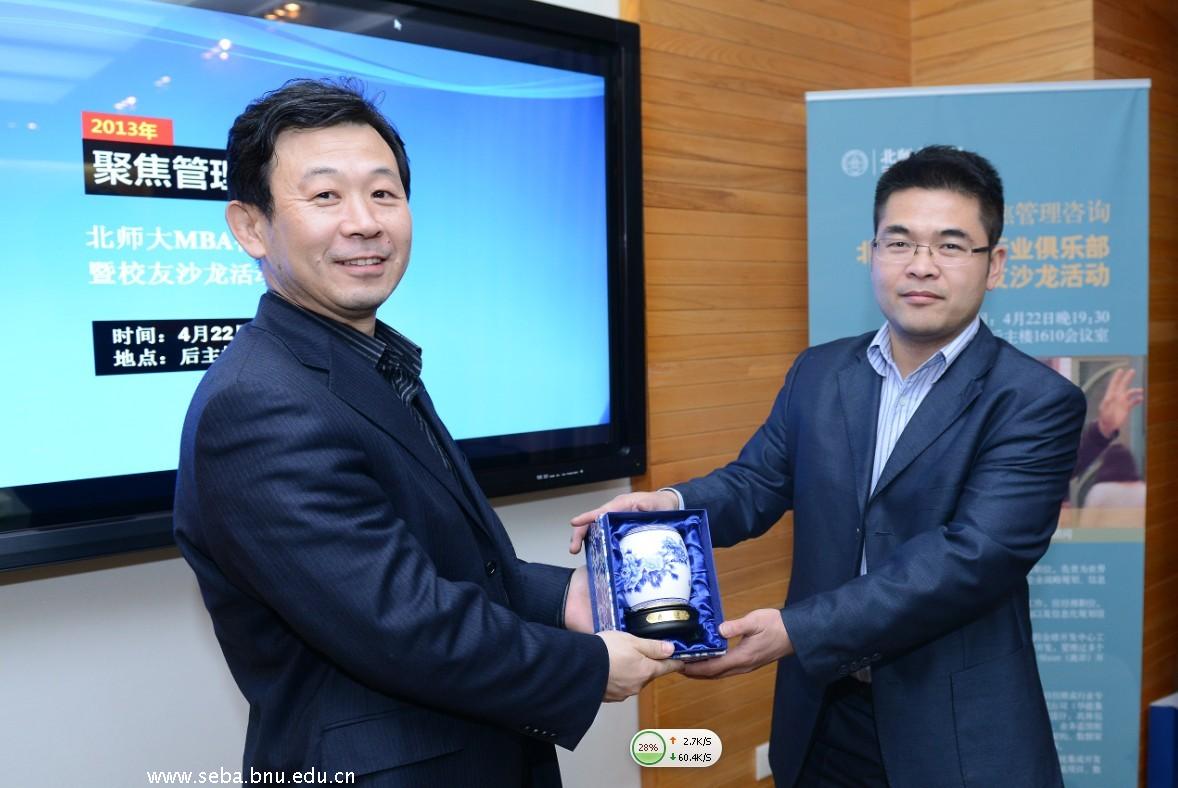 2013年4月22日晚19:30,周永钢校友返回母校,在北师大经管学院后主楼1610会议室与MBA同学一起分享了他对管理咨询的认识。经管学院MBA教育中心主任苏凇博士参加了本次沙龙活动。苏老师对周永钢总监表示了热烈的欢迎并赠送了纪念品。MBA教育中心王娟老师主持了本次活动,张晓娜老师参加本次活动并进行了现场微博报道。