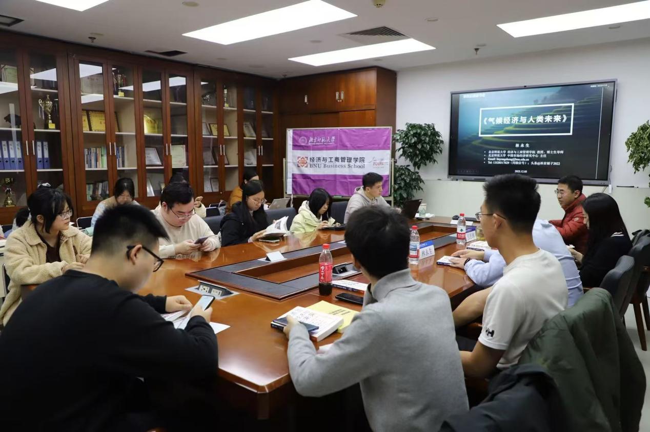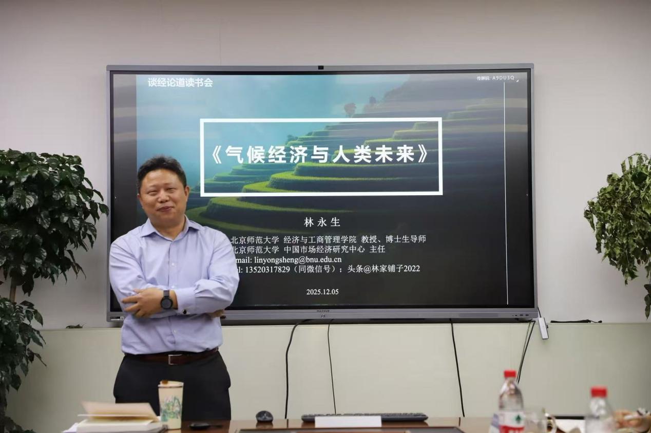 为拓展多元导学互动场景,营造良好的导学氛围,2025年12月5日下午,北京师范大学经济与工商管理学院第二期谈经论道读书会于后主楼1722顺利举办。本次读书会的领读人为经济与工商管理学院的林永生教授,他带领大家交流研讨了《气候经济与人类未来》一书的主要观点与相关启示,现场气氛亲切而热烈。本次读书会由我院张惠琳老师主持,不仅吸引了我院同学的踊跃参与,也得到了环境学院、地理科学学部等外院的同学的积极响应。