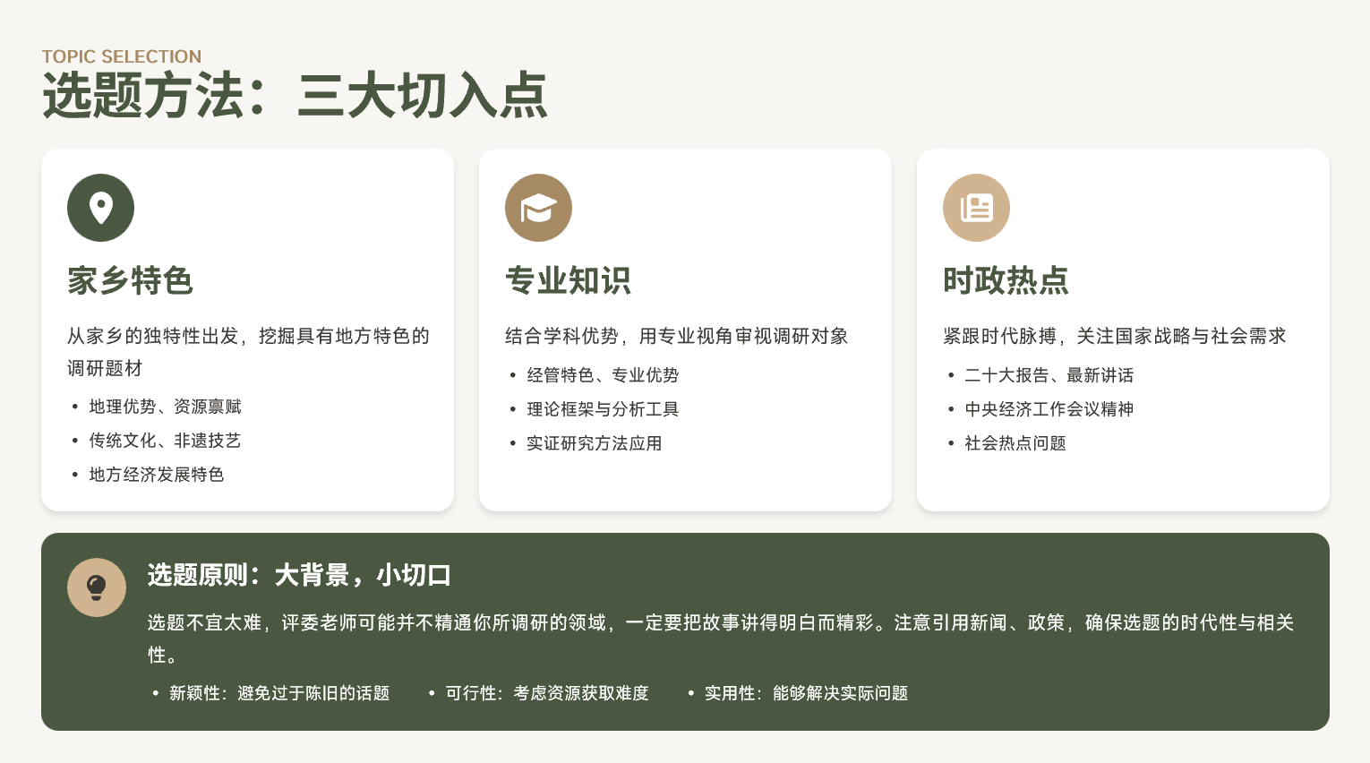 在“选题方法” 的分享中,刘昱主要讲解了选题的重要性,并梳理出好选题的三项核心要求:第一,具有家乡特色;第二,贴合国家重大会议的决策方针;第三,结合专业知识。大家选定选题时,可借鉴现有论文成果,结合家乡特色找到创新切入点,围绕政策导向展开分析,最终确定合适的选题。