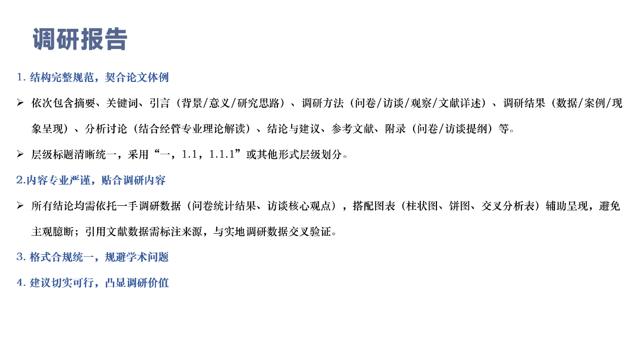 在“成果总结”部分,刘昱着重要求成果中的调研报告要做到完整、有逻辑、严谨且美观。报告封面要简洁且契合主题,绪论部分力求简洁,可多参考经典论文;结论要辩证分析,建议内容写详细,也要如实说明调研的短板。图表制作能使用问卷星、PPT 等工具,数据分析可采用 SPSSAU 网页版软件。AI虽能辅助完成部分工作,但大家不能完全依靠 AI 开展调研相关任务。