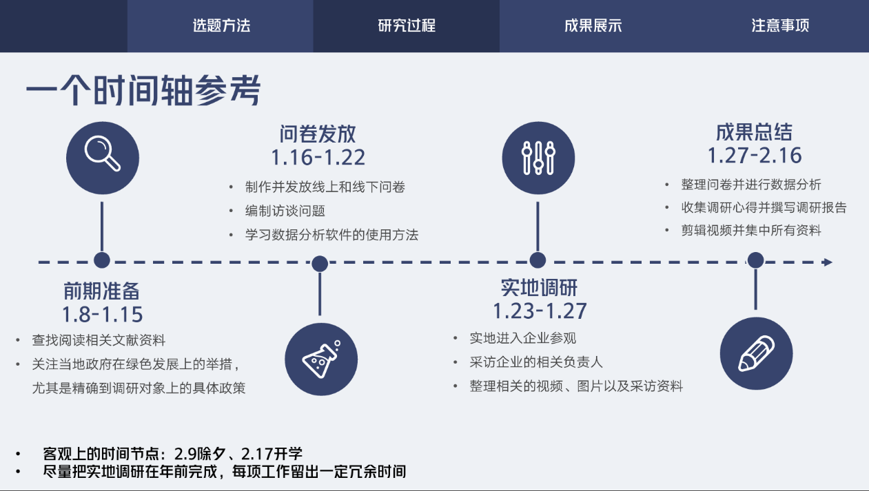 讲到“调研过程”,刘昱最先提醒大家做好调研的时间安排,提议实地调研尽量在年前全部完成。发放问卷时,同学们要对比线上、线下两种形式的优劣,提前规划好采访大纲。