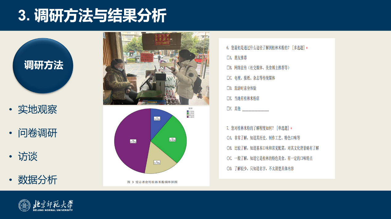 在“调研方法与结果分析”部分,侯予童梳理了四类核心调研方法:实地观察、问卷调研、访谈、数据分析。问卷设计涵盖品牌了解途径、认知程度、消费频率等问题;结果分析需结合问卷统计数据、实地考察图片及访谈记录。