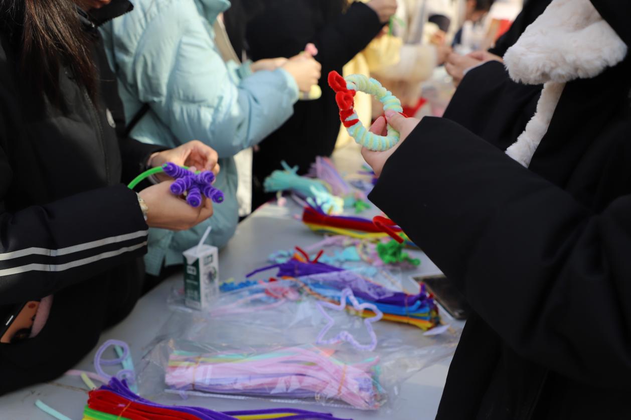 “‘益’起做手工—扭扭棒创童趣”区域则充满了童真与创意。彩色扭扭棒在同学们手中变成花朵、小动物等可爱作品,有人选择带走留作纪念,有人则将作品捐赠,希望为留守儿童带去手工制作的温暖与快乐。