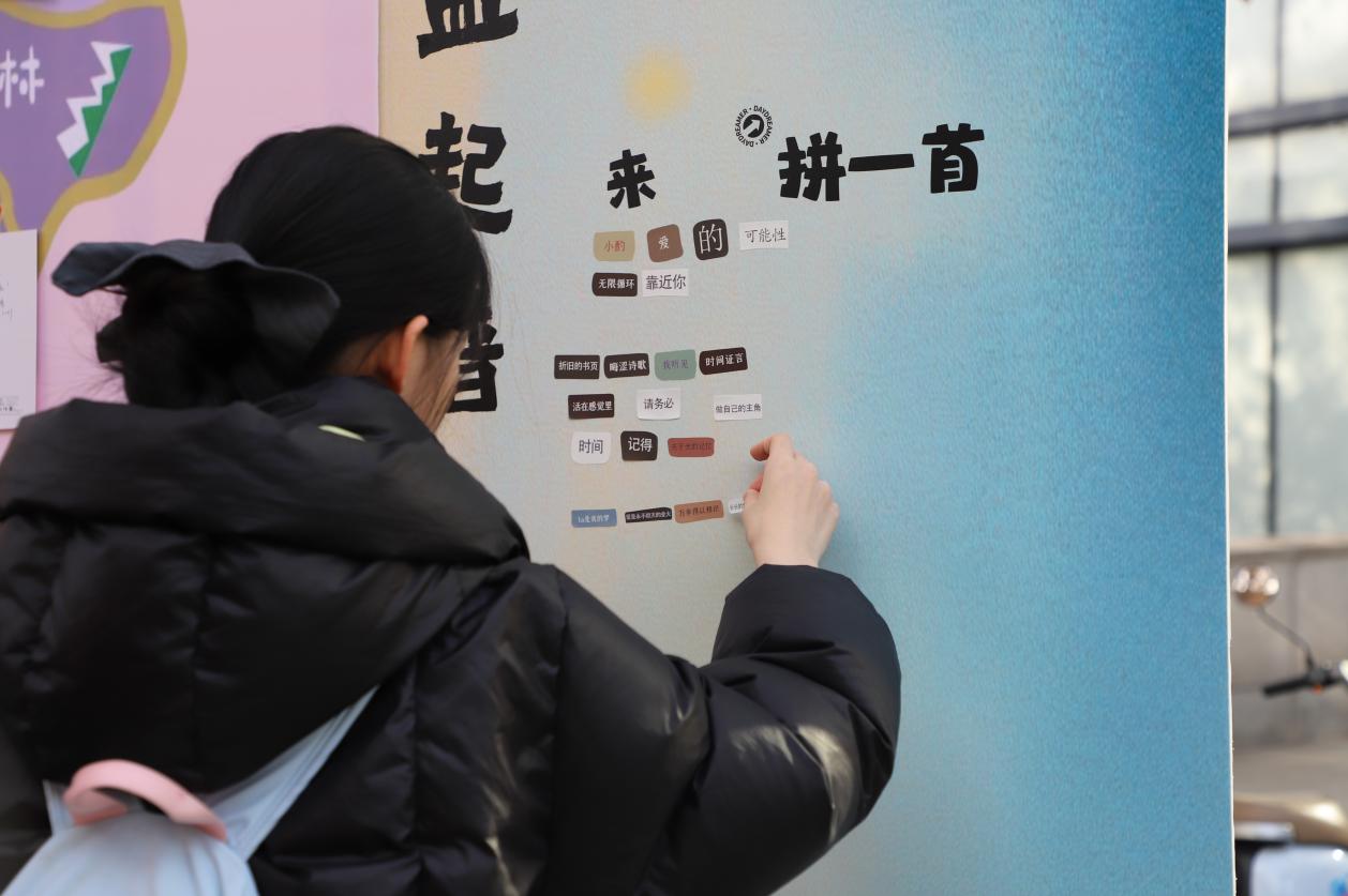 “‘益’起谱心声—拼贴暖心情怀”区成为创意与温情的聚集地,同学们从贴纸中挑选温暖词汇自由组合,拼贴出一首首专属歌谣,每一幅作品都凝聚着独特的思绪。大家纷纷与自己的创作合影,定格这份独特的公益记忆。