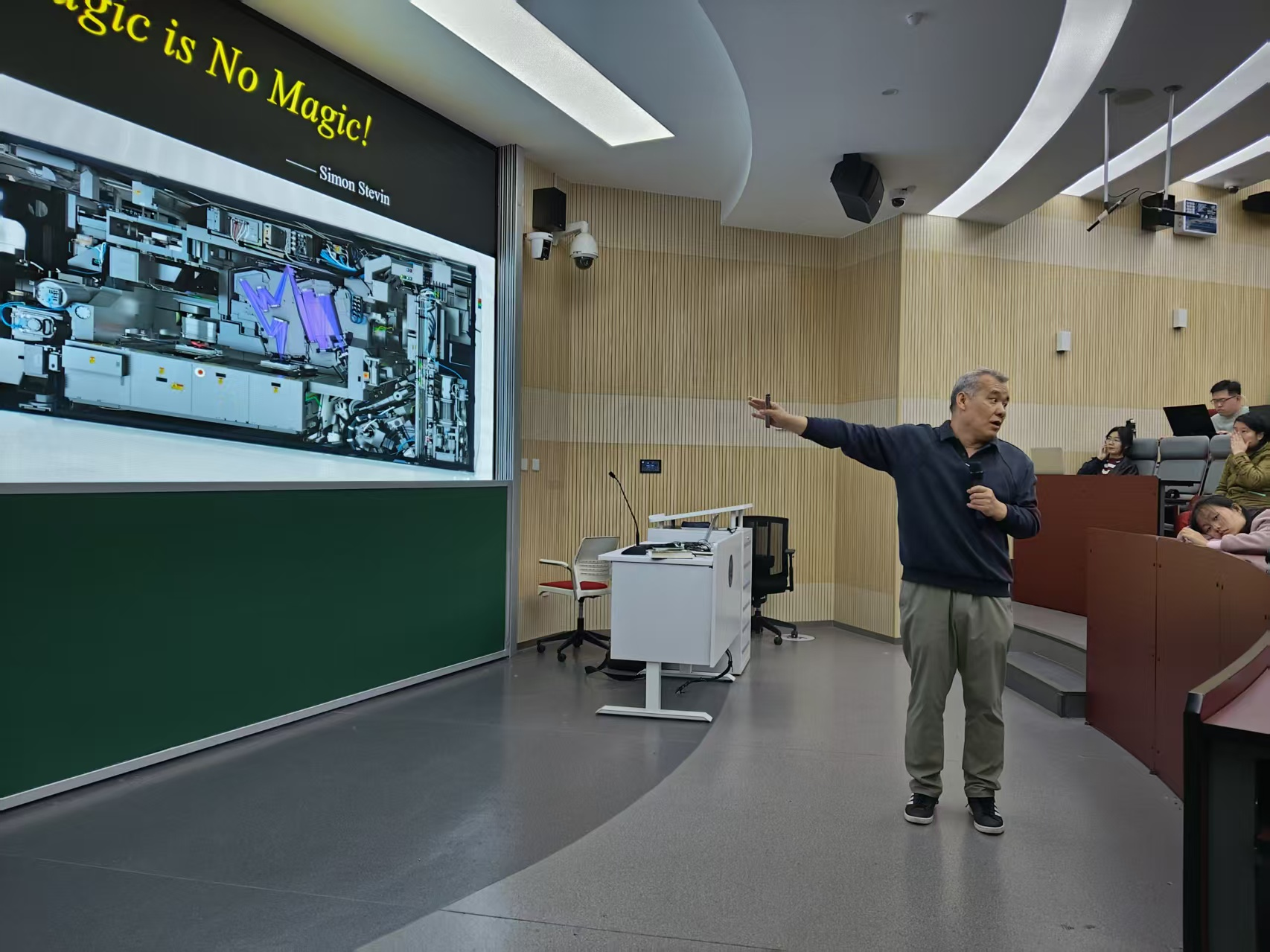 曹老师的精彩演讲让在座同学收获丰富。他系统梳理了荷兰多年的物理学积淀,结合荷兰在玻璃工艺、电子显微镜等工业制造上的深厚经验,并引入荷兰艺术中蕴含的数学与审美,深刻揭示了最先进光刻机诞生的背后是科学知识、工匠精神与艺术品位的长期融合。讲座不仅阐明了光刻机的核心逻辑,也让学生理解到芯片作为技术复杂性顶端的跨学科本质。本次讲座在师生们的热烈掌声中圆满结束。