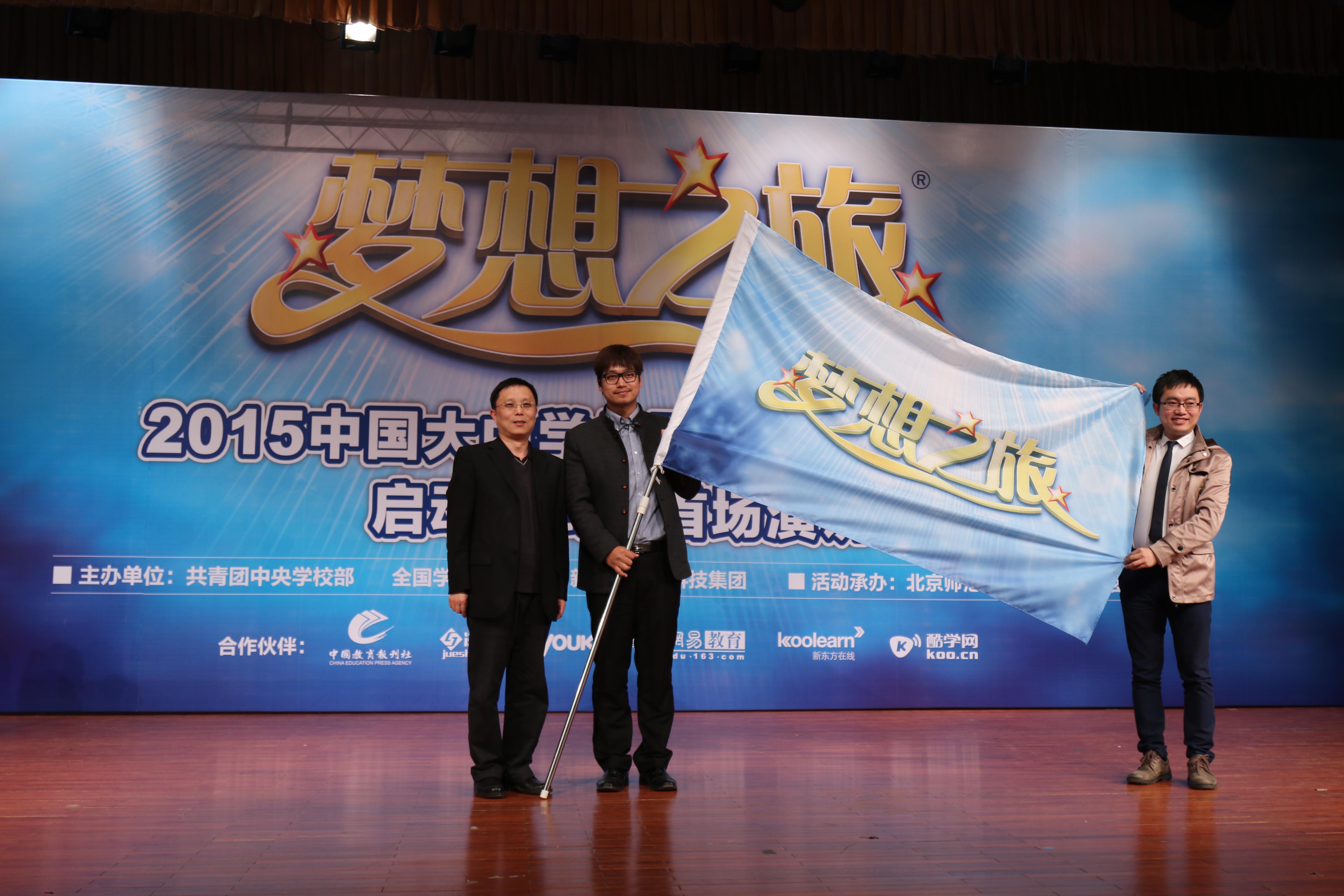 然后,决胜网创始人CEO戴政介绍了2015年决胜东方创业大赛,并鼓励青年学子们积极参与。此后,共青团中央学校部副部长李骥在启动仪式上向梦想之旅第一阶段执行负责人贺乐和新东方讲师代表周帅授予旗帜,这标志着2015梦想之旅从北师大正式起航!