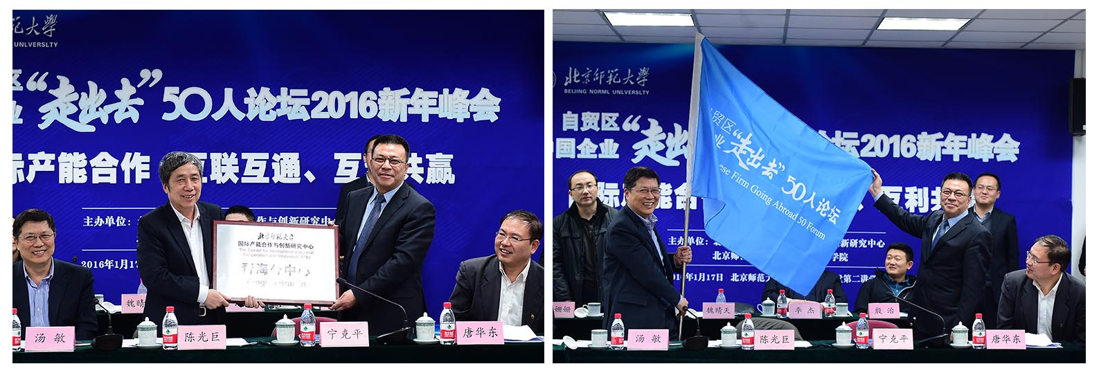 2016年1月17日下午,“自贸区——中国企业走出去50人论坛”2016新年峰会在北京师范大学英东学术会堂第二讲学厅盛大举行。北京师范大学副校长陈光巨,青海省政府金融办公室主任宁克平,国务院参事、国务院扶贫办友成企业家扶贫基金会常务理事长汤敏,国务院参事室参事业务二司副司长唐华东,国务院参事室特约研究员、国家能源局原副局长吴吟,国务院参事室特约研究员、国家发改委能源局原局长徐锭明,经济与工商管理学院副院长崔学刚教授、学院教师沈越教授、郑飞虎副教授、蔡宏波副教授、焦豪副教授参加了会议,以及校友中微小企业投资集团CEO申杲华,北师大青海省校友分会会长魏晴天,大诚财富(香港)集团控股有限公司戴伟伟等,会议同时邀请到企业家代表、金融领域代表和专家学者代表等与会座谈。会议由北京师范大学国际产能合作与创新研究中心主任仲鑫教授主持。