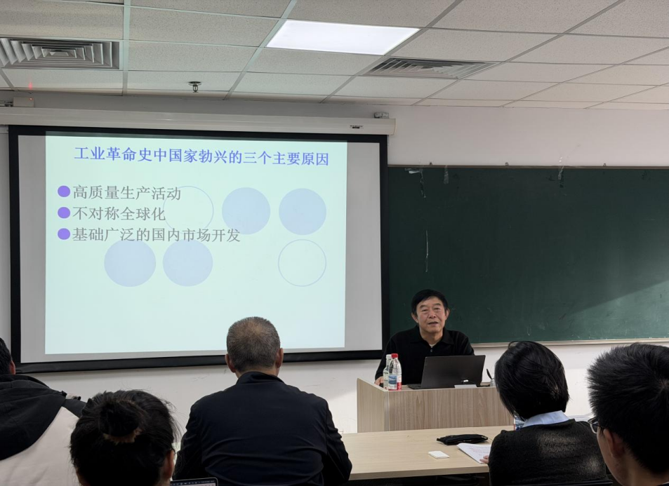 2025 年 11 月 12 日下午,第 155 期京师经管名家讲坛暨经济史讲坛第 4 讲在京师大厦 9407 举行。本次讲座邀请到的主讲人贾根良教授,是中国人民大学吴玉章高级讲席教授,同时入选教育部 “国家级人才项目” 特聘教授,享受国务院政府特殊津贴,在经济史、政治经济学等领域深耕多年,学术成果丰硕且极具影响力。讲座以 “从工业革命史中探寻国家兴衰的根源” 为主题展开深度分享,由政治经济学系陈月圆老师主持,30 余名本硕博学生到场聆听。