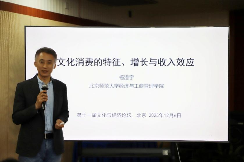 北京师范大学经济与工商管理学院杨澄宇教授作论坛最后一个主旨演讲,他聚焦文化消费问题,从经济学视角分析了其特征、发展趋势及其与收入的关系。他指出,我国文化消费增长迅速但仍不均衡,城乡差距显著,整体水平较美、日等发达国家仍有较大提升空间。他认为,文化消费存在明显的“收入门槛效应”:居民收入需达到一定临界值后,才会产生文化消费;此后其占收入比重随收入提高将经历一个快速上升的阶段,之后才缓慢下降。此外,随着收入提高,文化消费结构也从实体产品购买转向更多地进行文化服务体验。杨澄宇教授进一步通过理论模型和数值模拟论证了上述结论,最后讨论了“收入门槛效应”的政策含义。针对临界值附近的低收入群体,通过收入补贴、消费券或价格优惠等精准措施,均可有效激发其文化消费潜力,这对促进消费公平、缩小城乡差距具有积极作用。
