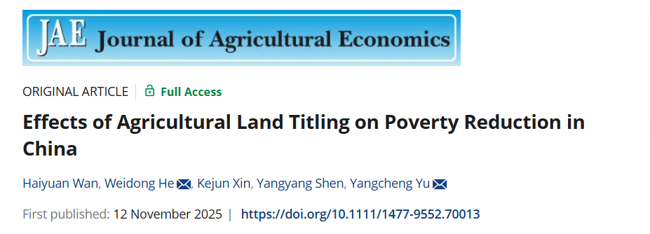 近日,以北京师范大学经济与工商管理学院为第一单位的研究论文“Effects of Agricultural Land Titling on Poverty Reduction in China”在农业经济学领域顶级期刊Journal of Agricultural Economics在线发表。我院万海远教授和博士研究生贺伟东分别为第一作者及通讯作者,我院沈扬扬副教授和博士研究生辛柯均为共同作者,上海大学经济学院郁杨成老师为共同通讯。