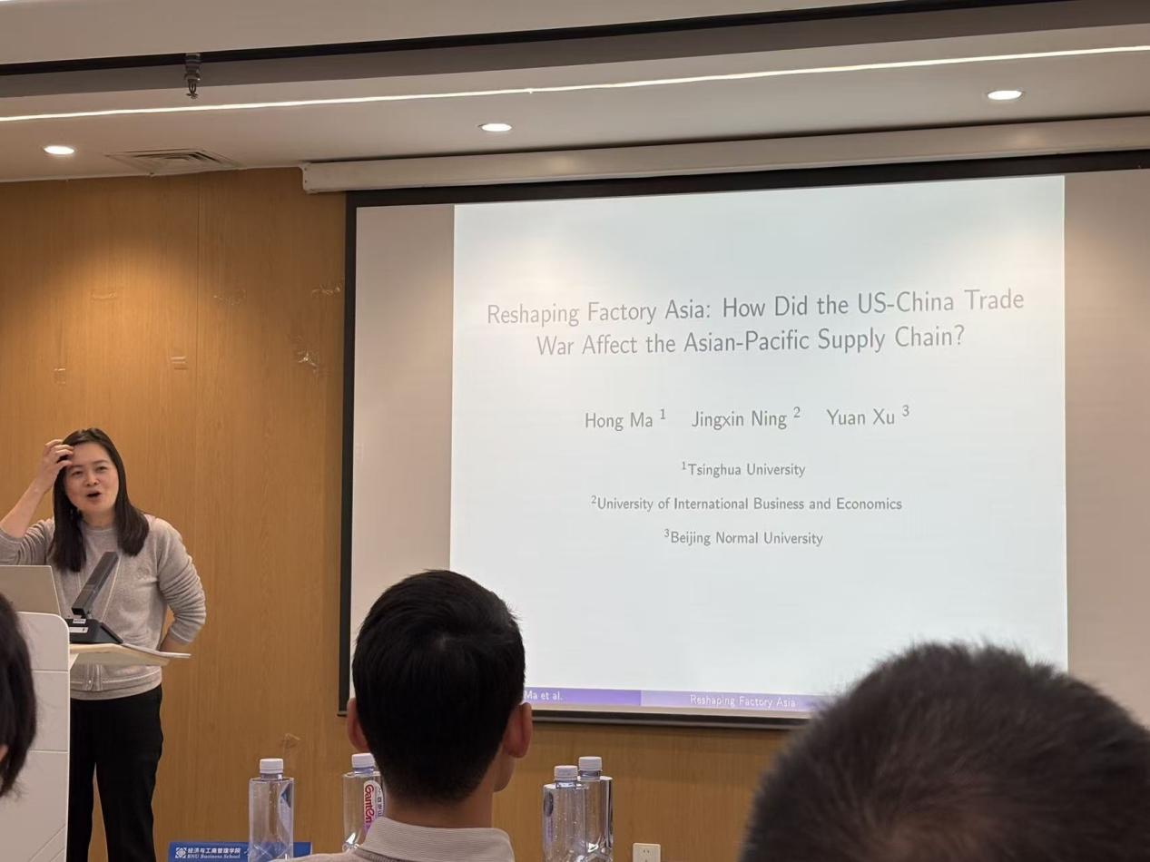 北京师范大学徐嫄教授作了Reshaping Factory Asia: How Did the US-China Trade War Affect the Asian-Pacific Supply Chain 的报告。该文在“亚洲—美国供应链”框架下,评估中美贸易战对亚太供应链布局的冲击与再平衡。基于2017–2019年海关数据和关税数据,发现:美国在2018年贸易战后自亚洲整体进口份额基本稳定,“去中国化”主要体现为中国增加值经东盟等第三国“绕道”进入美国。文章进一步利用加工贸易数据构建产品级投入产出网络,在 DID 模型中区分直接效应(被加征关税的中国产品对美出口下降)与间接效应(下游减产压缩中国自日韩台等上游经济体的中间品进口)。最后,在多国多部门 Armington 一般均衡模型下,对比2018–2019年美国对华加征关税与2025年美国全球层面新一轮关税加征,结果表明前者主要导致区域内产能再分配,而后者显著压缩全球贸易,中美及大多数国家均为净输家。
