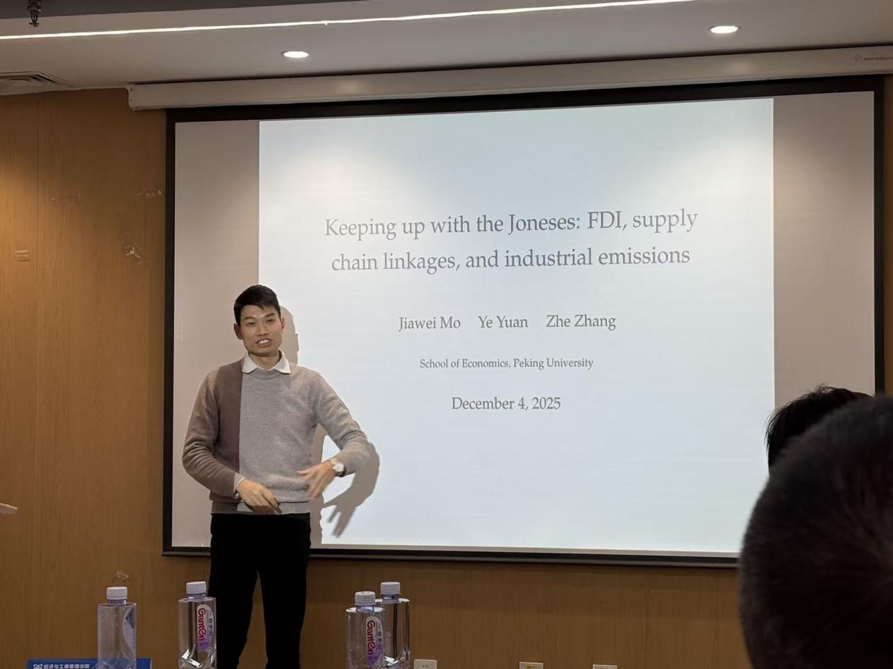 北京大学莫家伟教授作了题为 Keeping Up with the Joneses:FDI, Supply Chain Linkages, and Industrial Emissions的报告。文章聚焦外商直接投资(FDI)对发展中国家环境表现的影响,利用中国工业企业排放数据与地理信息,结合企业间供应链关系,发现外资企业进入对周边本土企业具有显著的减排溢出效应。 研究进一步表明,环境表现相对“更清洁”的外资企业,会显著降低周边本地企业的排放强度,而“更肮脏”的外资则可能产生相反效果,FDI 的减排影响还具有明显的空间约束,即在 10 公里范围内效应最大,随距离增加迅速衰减。机制表明,这一效应通过上下游供应链进一步传导:一旦与外资企业建立供应链联系,本土企业在生产技术、绿色投资、环保声誉等方面均出现系统改善。