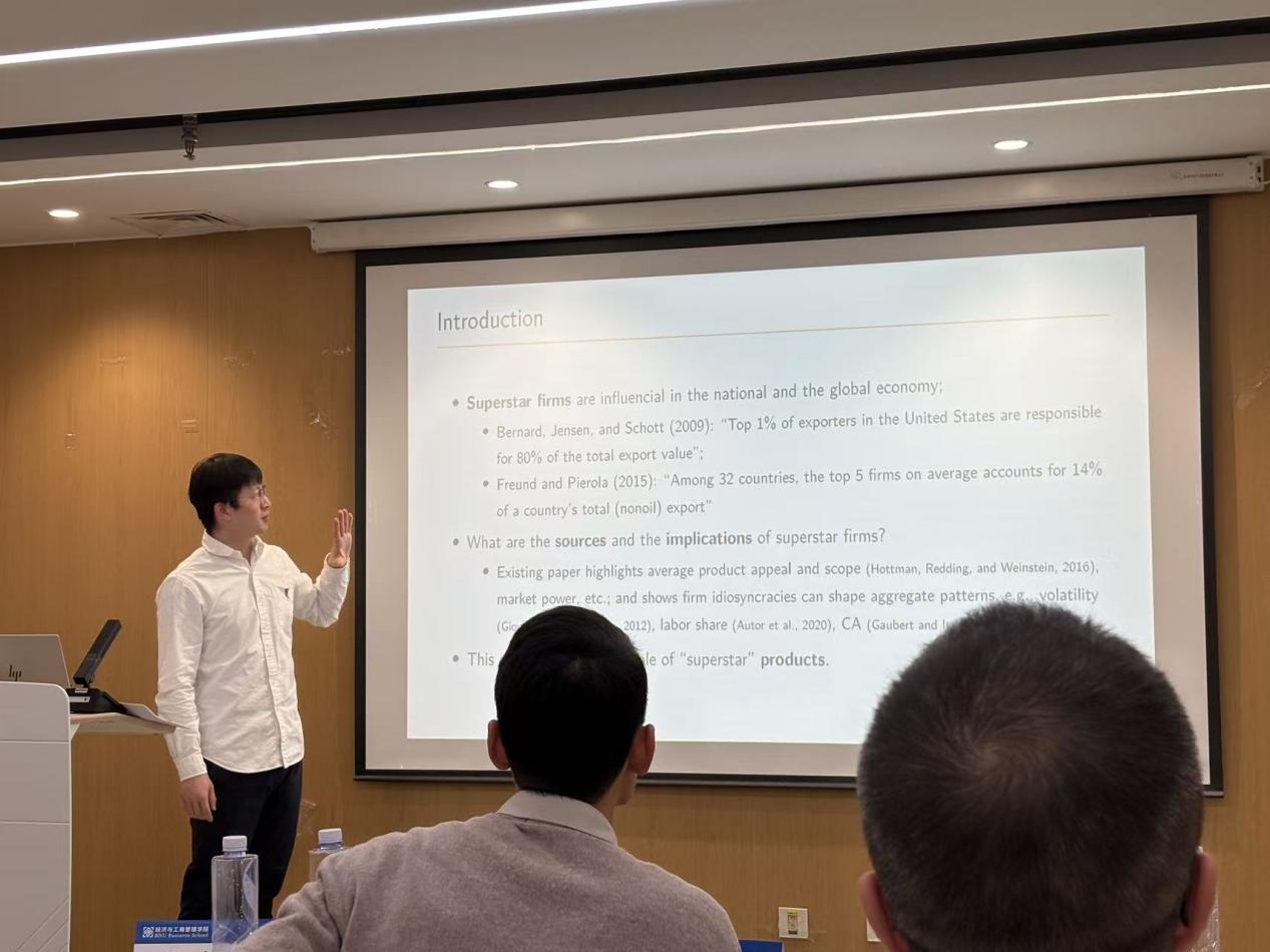 北京大学薛思帆教授作了Superstar Products by Superstar Firms的报告。该文在“超级出口企业(superstar firms)”文献基础上,将关注点下移至企业内部的“超级产品(superstar products)”,从实证和理论两个层面考察其对企业出口行为及宏观贸易模式的影响。在实证方面,利用中国海关企业–产品–目的地出口数据,得到几项典型事实:(1)企业内部销量高度集中于少数产品,呈明显肥尾分布;(2)行业出口变动中,逾半由“超级企业–超级产品”这一子集解释;(3)Top1 产品份额越高,企业对距离等贸易成本的敏感度越低,且外部市场规模扩大,会在随后几年系统性抬升各目的地的 Top1 份额。 在理论方面,该研究构建多国—多产品贸易模型,将企业刻画为在常规与肥尾两类产品分布之间进行选择:后者需支付额外固定成本,以换取获得超级产品的更高概率,从而在固定成本与预期收益之间形成权衡。模型显示,贸易成本下降和市场规模扩大,一方面通过 portfolio effect 促使资源进一步向优势产品和市场集中,另一方面通过 upgrading effect 提高企业选择肥尾分布的激励,从而在总体上降低宏观贸易弹性、加深出口对少数超级产品的依赖。