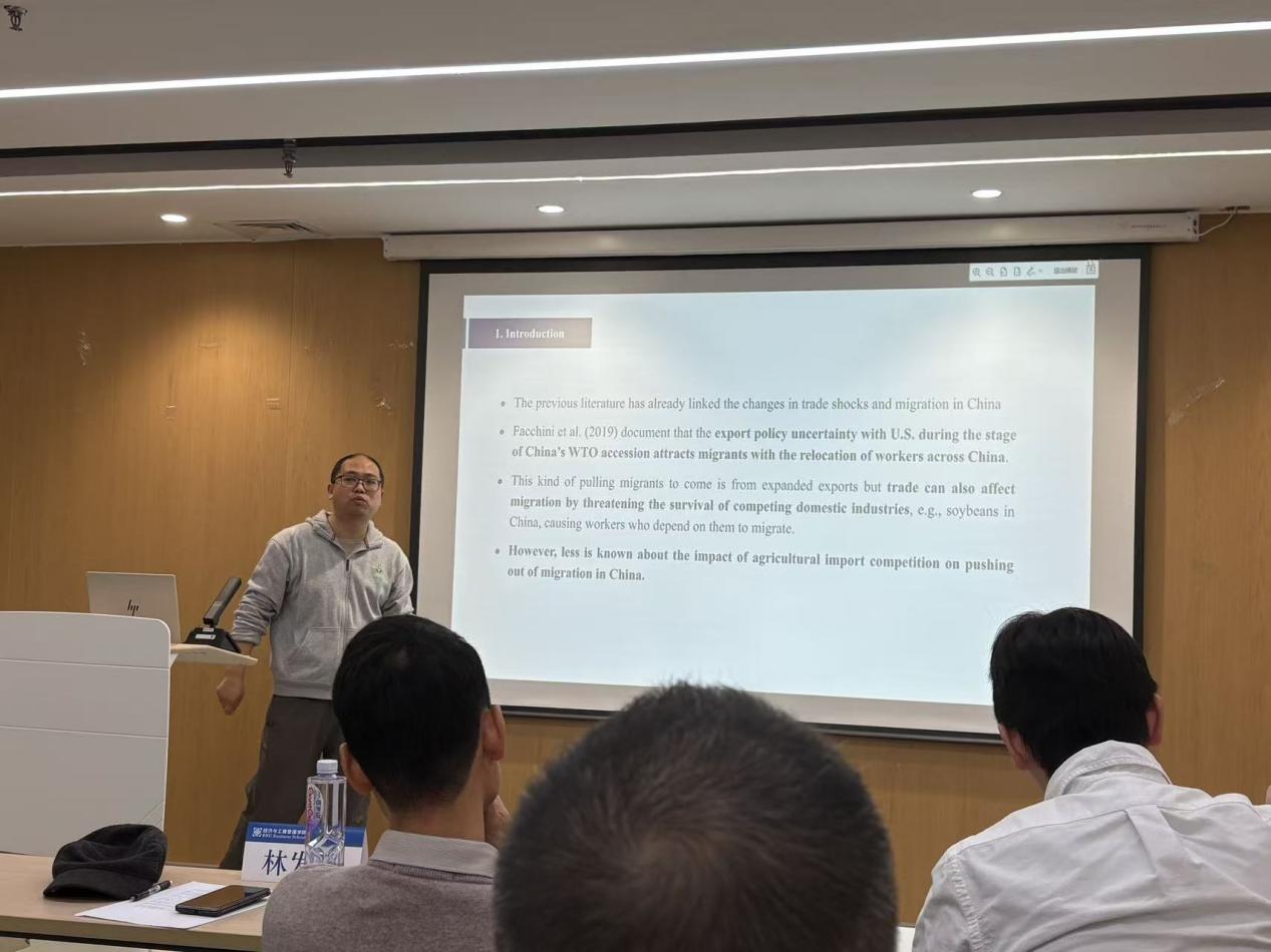 中国农业大学林发勤教授汇报了题为Trade Competition and the “Great Migration”:The Impact of Soybean Import Shock in China的研究。文章从东北地区大豆产业出发,考察农业进口竞争对人口迁移的推动作用。研究结合中国人口普查、农业生产及贸易数据,利用政策调整与进口规模变动构造冲击指标,发现大豆大量进口显著压缩了本地种植收益和相关就业机会,进而推动农村劳动力向外省迁移,加剧东北部分地区人口流出压力。对于长期移民和年轻劳动者来说,流出效应更明显,与此同时,大豆行业依赖程度较高的城市,面临更严重的福利损失和更大的人口外流风险。