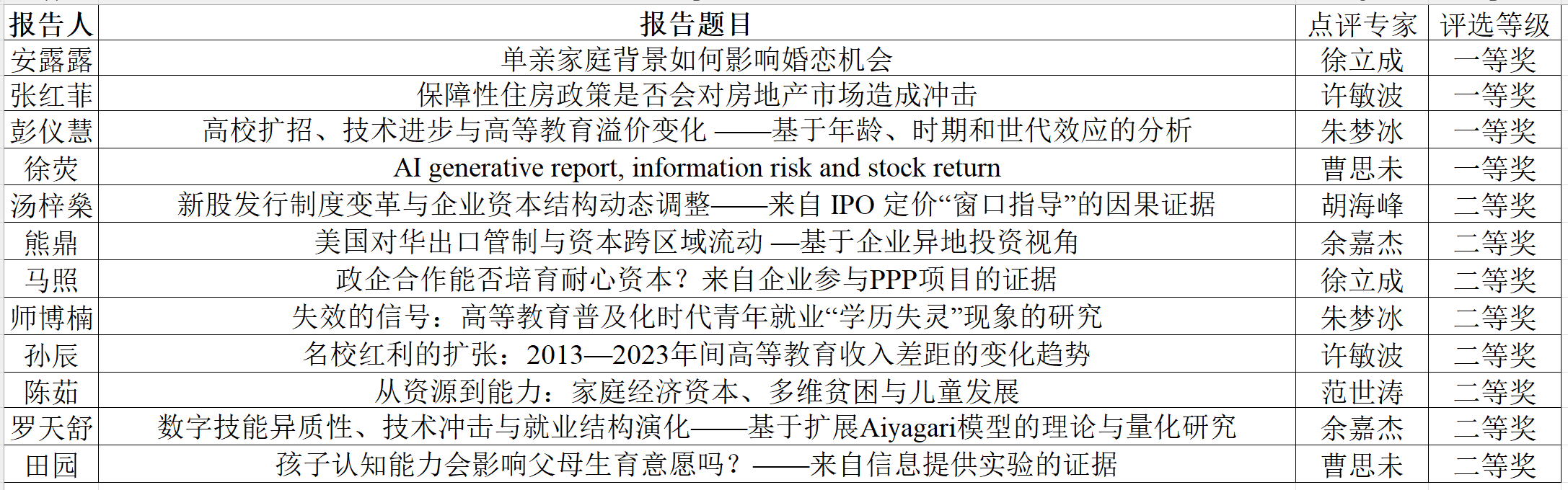 经济论坛在电子楼阶梯教室进行。经济与工商管理学院副院长江婕老师作开幕致辞,介绍了学院研究生培养情况与发展愿景,勉励与会同学培养学术探索精神,提高科学研究能力。许敏波老师、胡海峰老师、范世涛老师、朱梦冰老师、曹思未老师、余嘉杰老师、徐立成老师担任评议专家,2024级博士生卓震宇主持论坛。经济论坛共评审出12篇论文进行汇报展示,专家组在评议基础上评选出4篇一等奖论文、8篇二等奖论文并颁发奖状。在经济论坛中,每一位展示的同学都做了详尽的论文汇报,专家对论文做了专业的点评。评议环节围绕研究问题聚焦、理论与方法匹配以及写作表达等方面提出具体修改建议,促进同学据此推进论文完善。同学们收获颇丰,对于后续的论文改进有了巨大的信心。在经济论坛的最后,许敏波老师做闭幕总结,进行了师生合影留念。